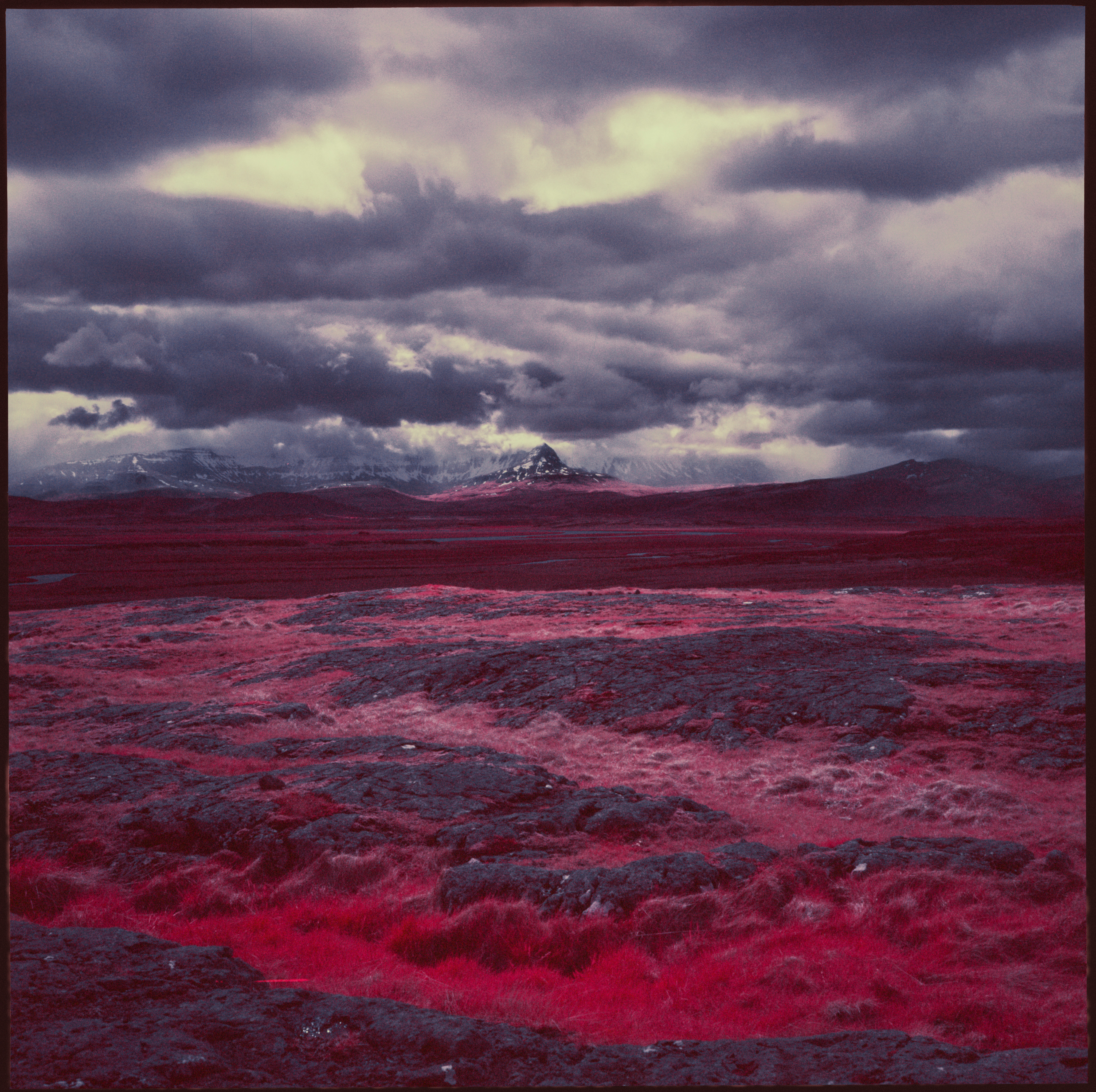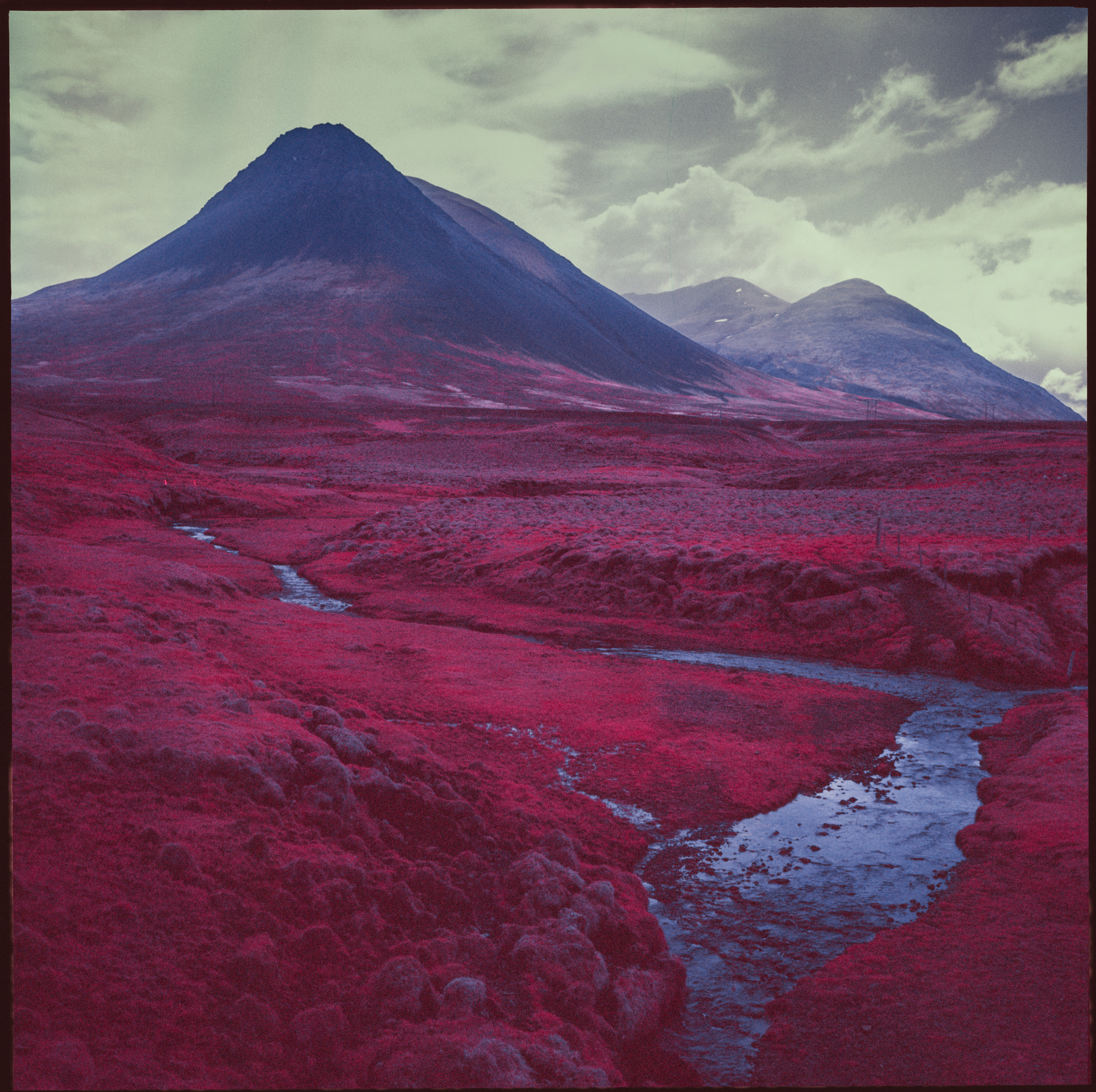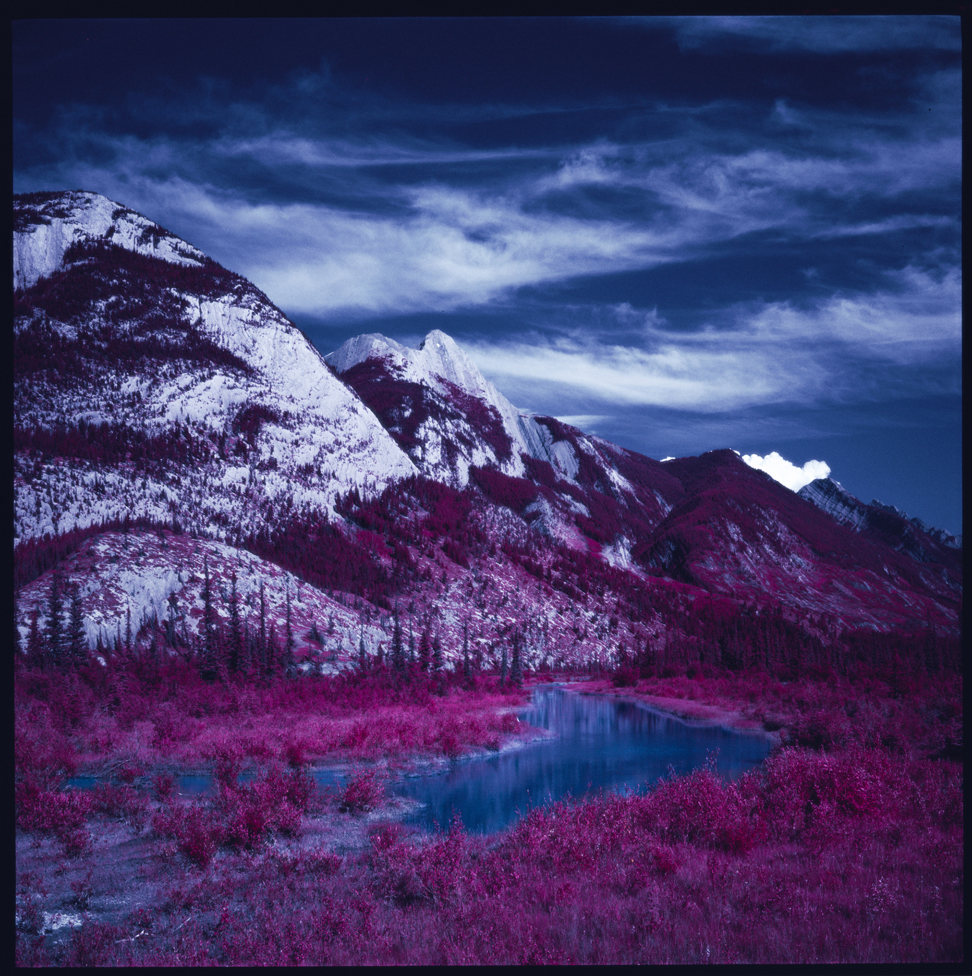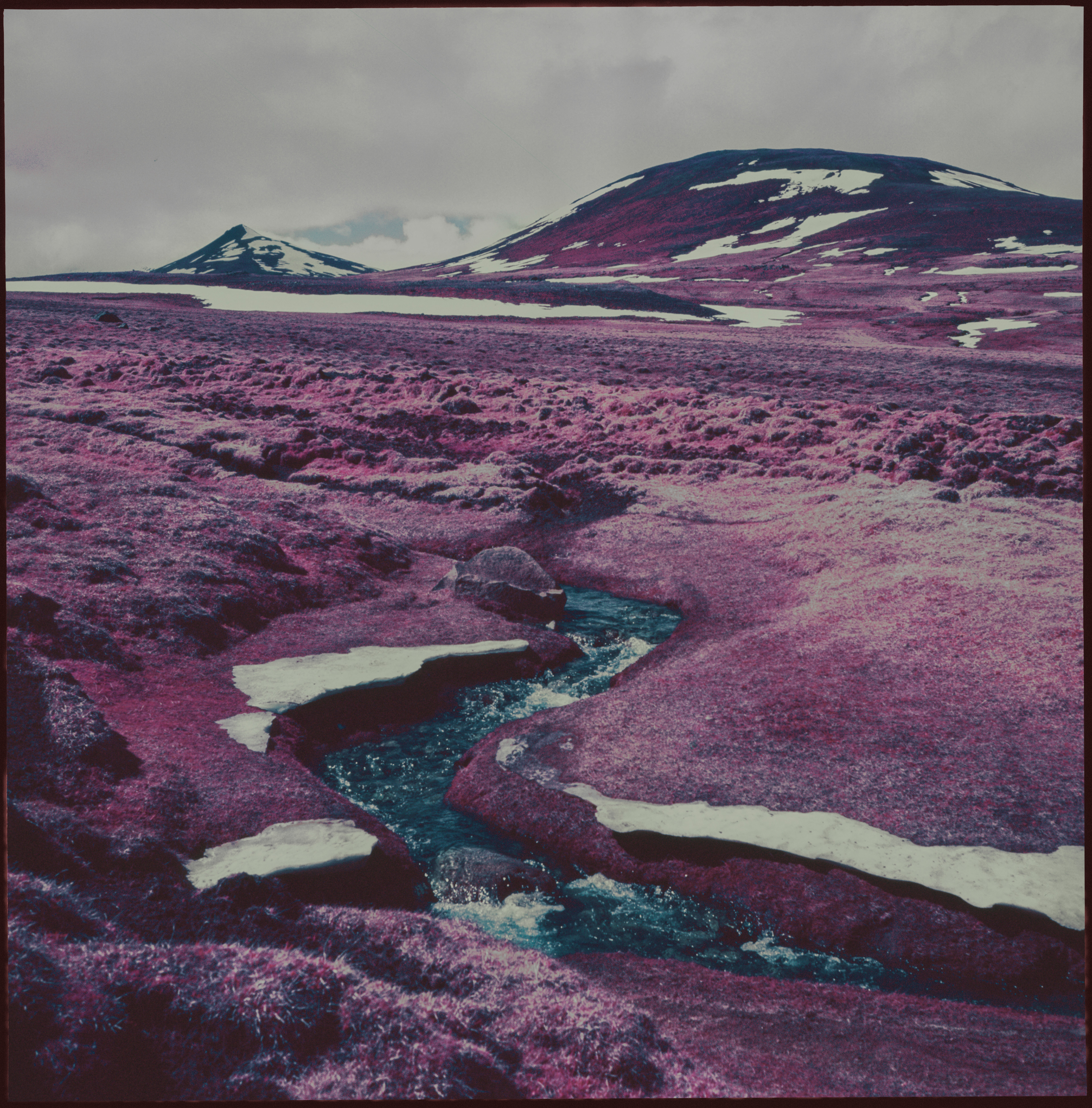 A series of landscapes utilizing a rare, color infrared-sensitive film originally designed by Kodak for scientific analysis. It is particularly significant that color-infrared film, as opposed to regular or images from black and white infrared film, allows for a unique, extra-dimensional analysis of the images. Kodak Aerochrome reacts vibrantly with plant foliage, and is capable of recording the health and vitality of countless plant species; additionally, the film reacts colorfully to record pollutants variously dissolved in water, ice, or dispersed air. Developed for multiple research uses, including “ice reconnaissance,” the film is uniquely capable of demonstrating the presence of both artificial and biological substances in addition to measuring infrared radiation--all of which would only appear as various shades of gray on typical infrared film.