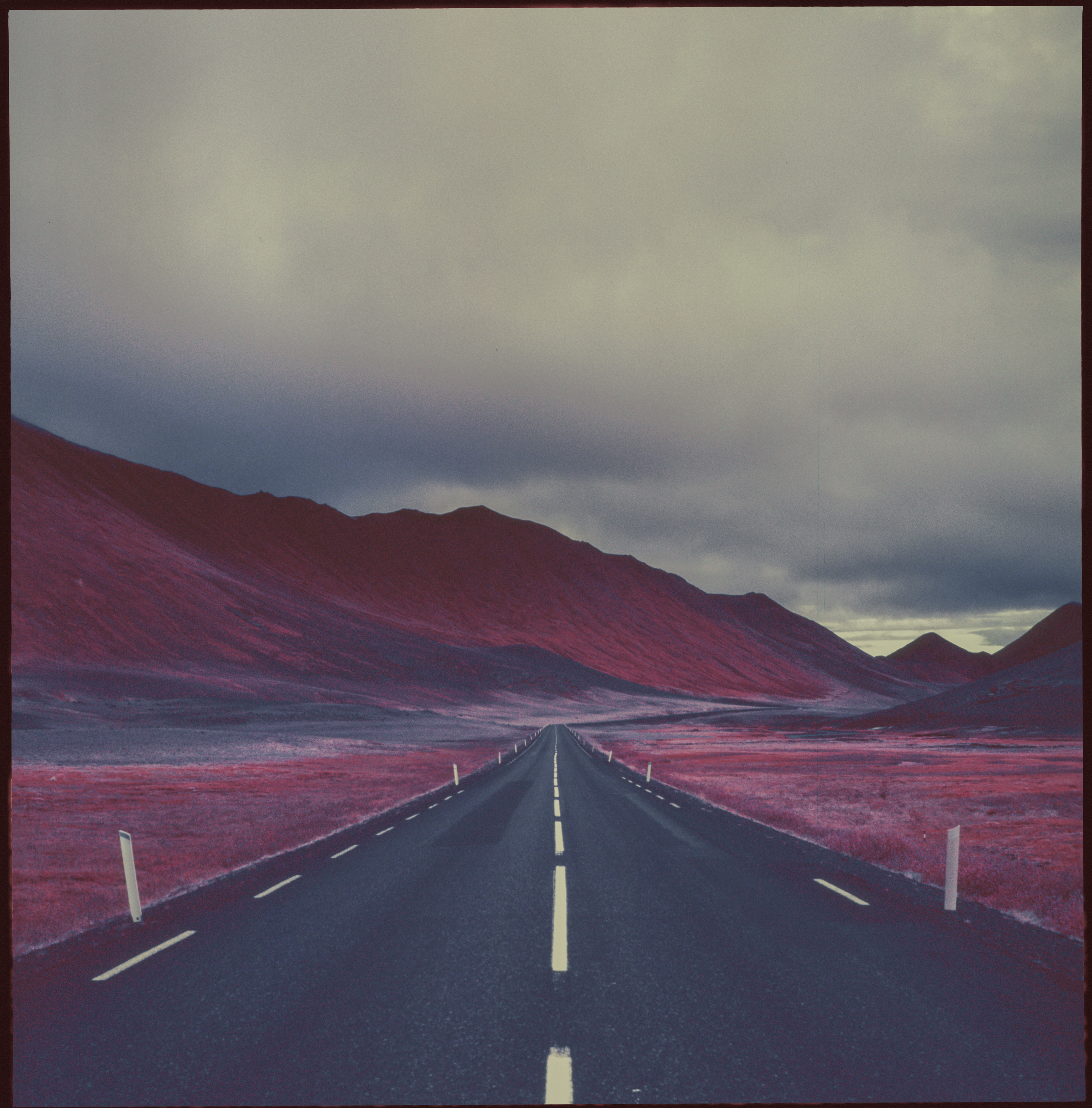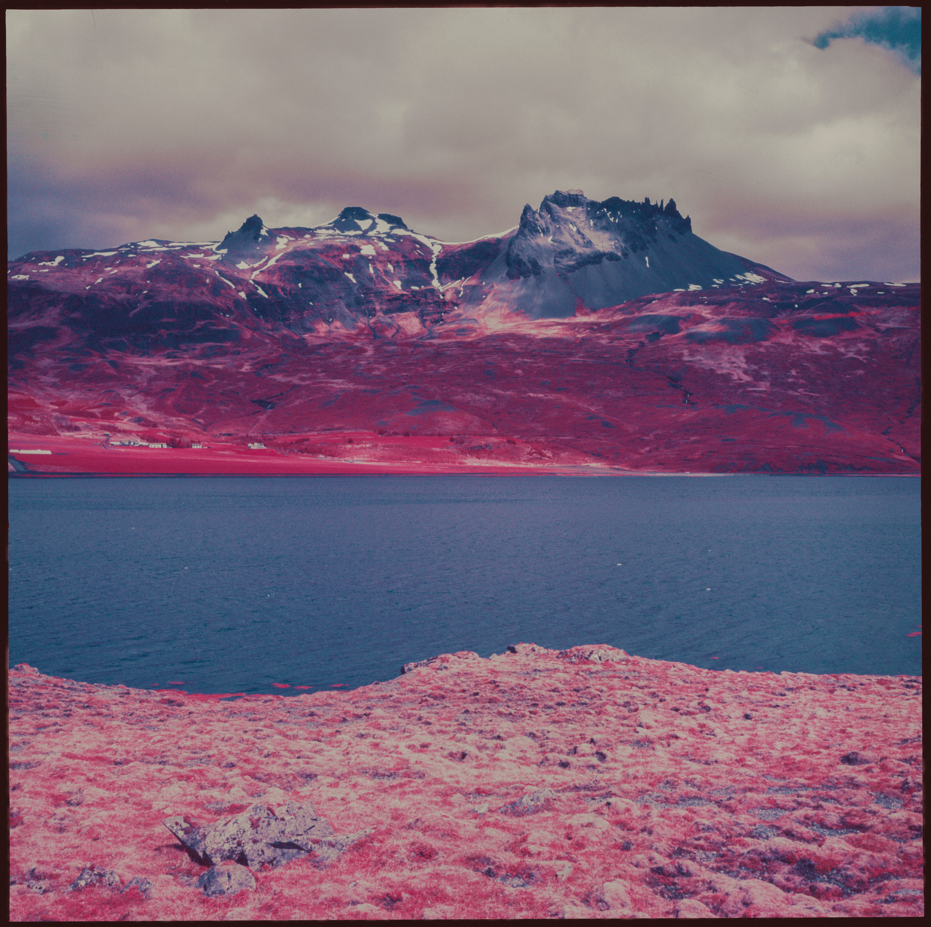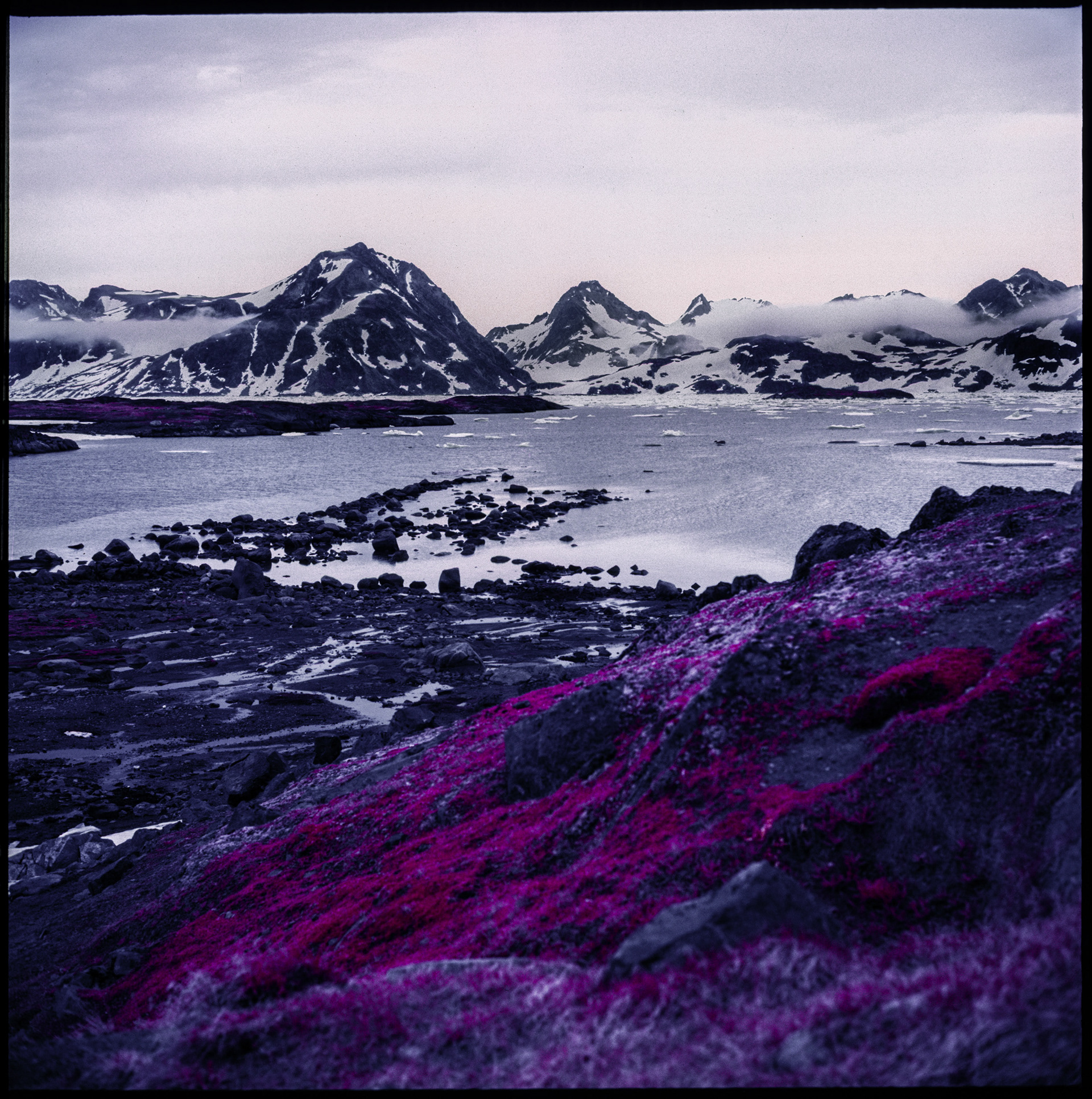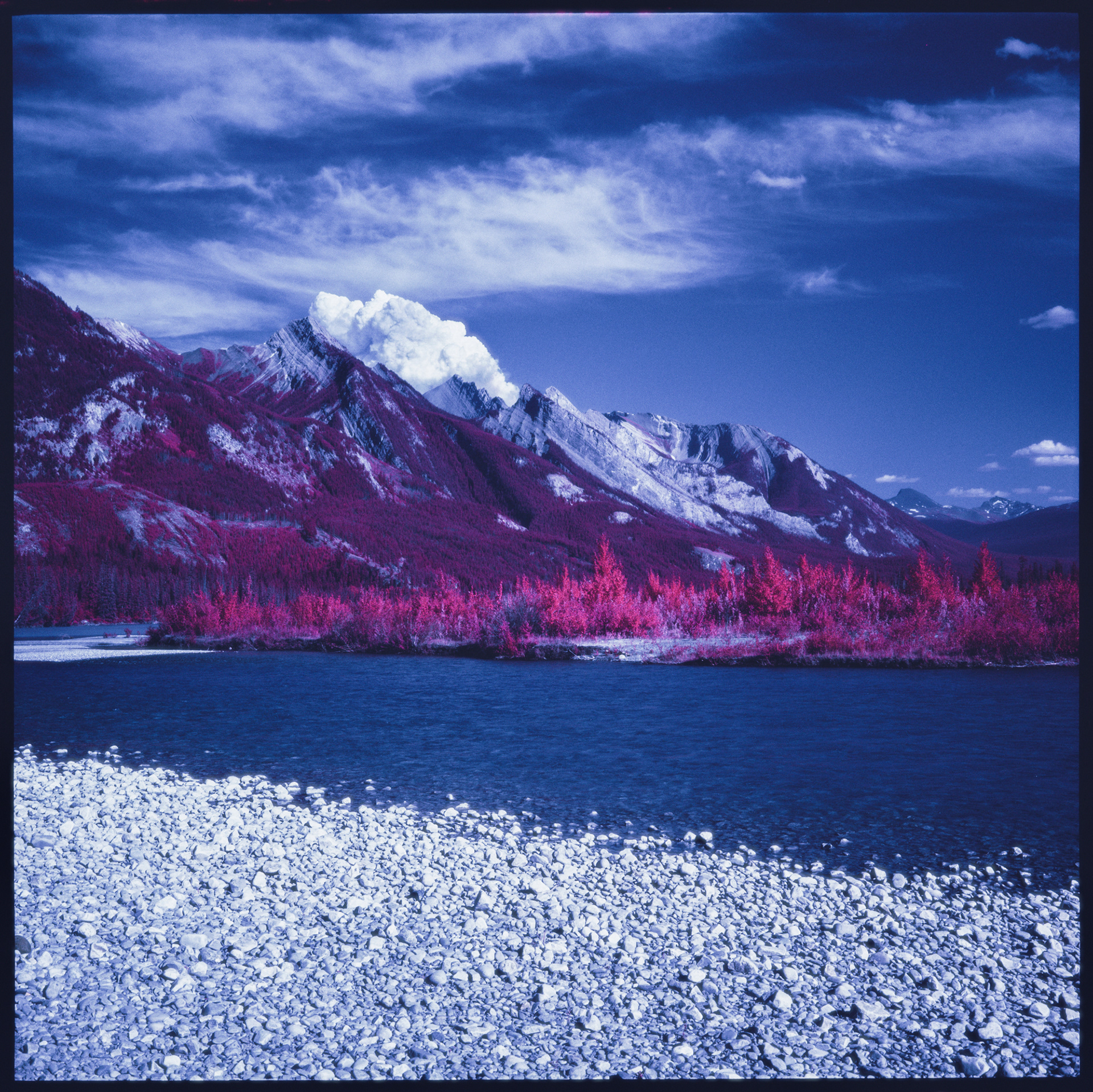 A series of landscapes utilizing a rare, color infrared-sensitive film originally designed by Kodak for scientific analysis. It is particularly significant that color-infrared film, as opposed to regular or images from black and white infrared film, allows for a unique, extra-dimensional analysis of the images. Kodak Aerochrome reacts vibrantly with plant foliage, and is capable of recording the health and vitality of countless plant species; additionally, the film reacts colorfully to record pollutants variously dissolved in water, ice, or dispersed air. Developed for multiple research uses, including “ice reconnaissance,” the film is uniquely capable of demonstrating the presence of both artificial and biological substances in addition to measuring infrared radiation--all of which would only appear as various shades of gray on typical infrared film.